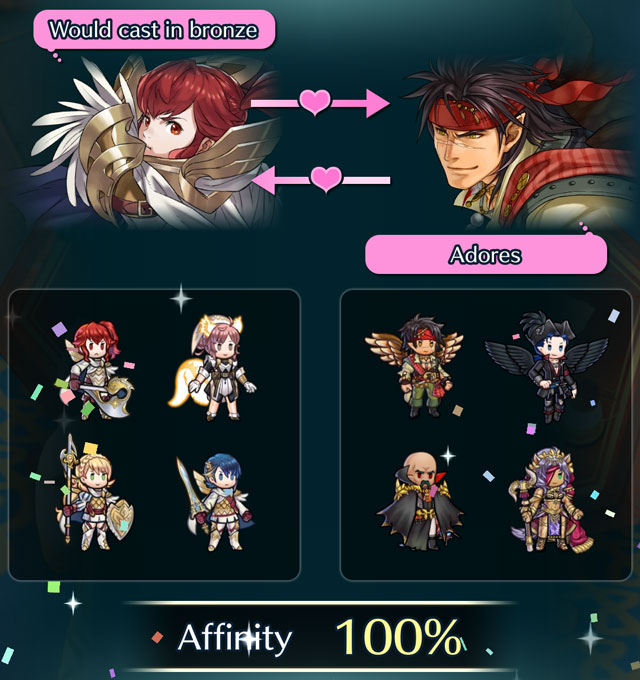 Once a partner has been selected, an affinity test is performed between the two players' teams, resulting in a score between 0 and 100. When the affinity level is between 25 and 50, every hero is granted +2 Atk/Spd/Def/Res, and +4 when the level is greater than 50. The affinity is random, and may change between tests given the exact same players and heroes. However, it is possible to raise the score when all the heroes from one player, or the two players, are from the bonus games. It can be further increases when one player has all heroes from one of the bonus game, and the other players from the other game, or when both teams are comprised of half heroes from one game and half from the another.