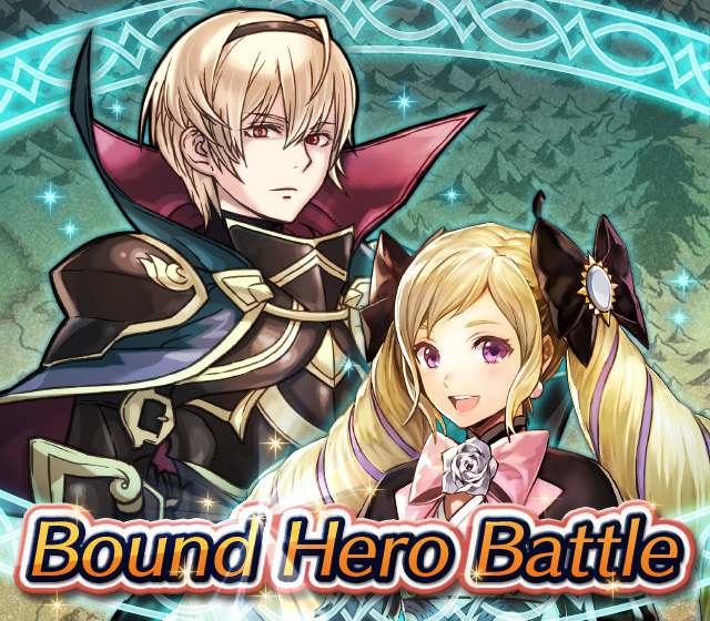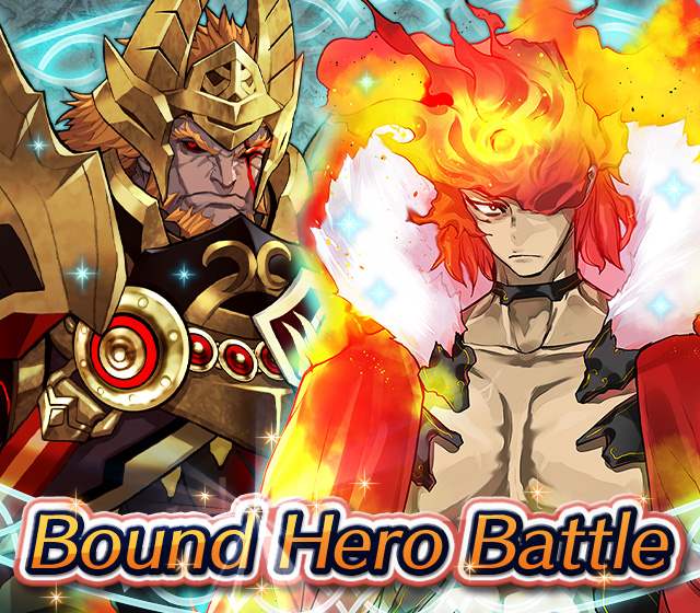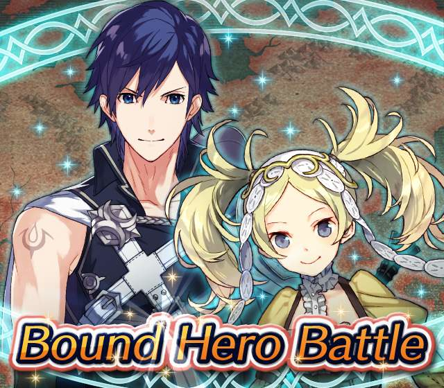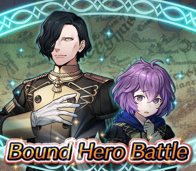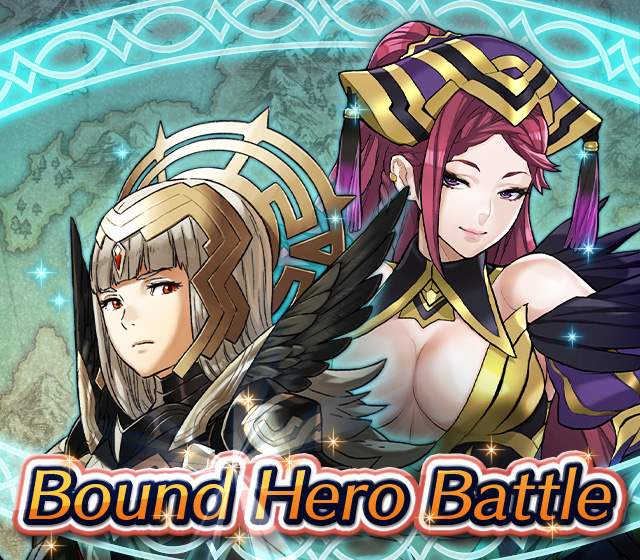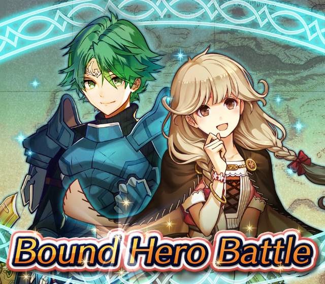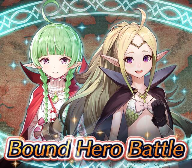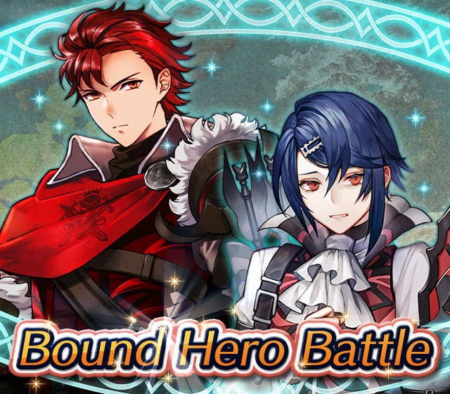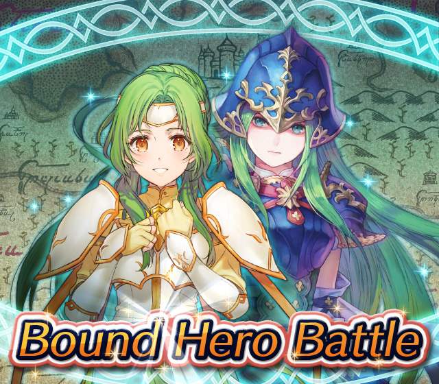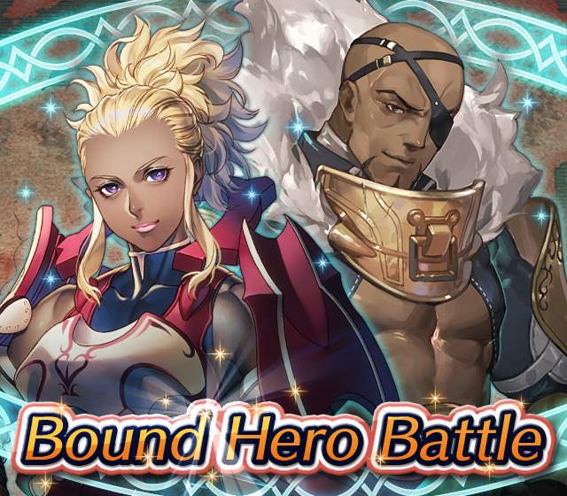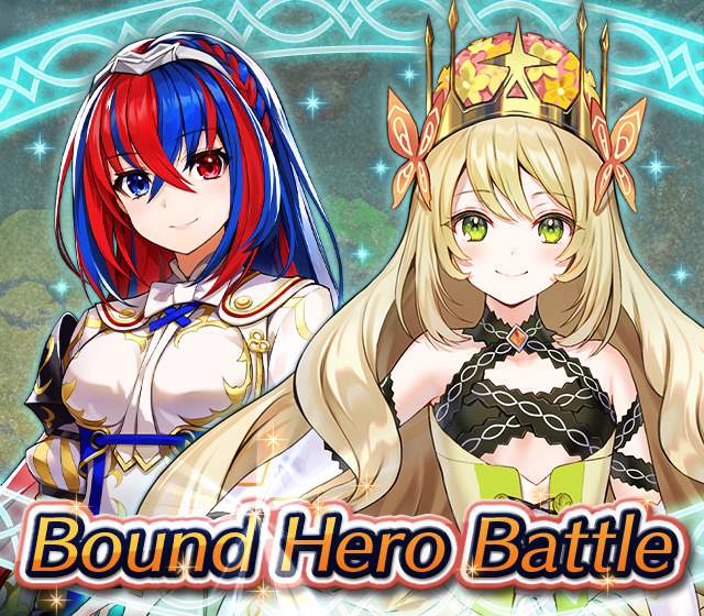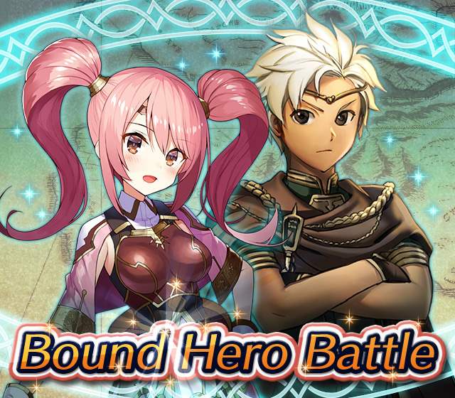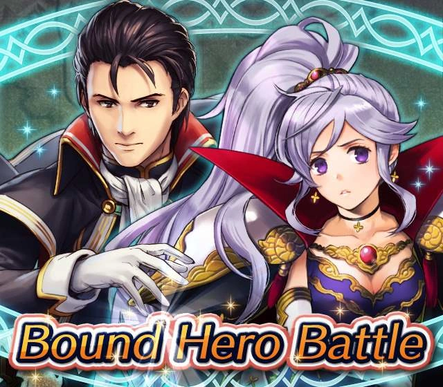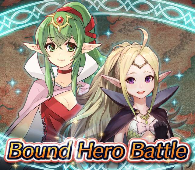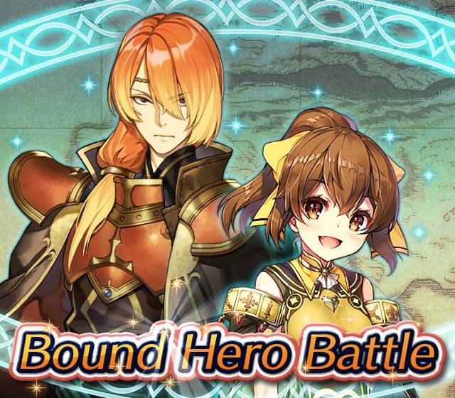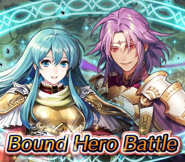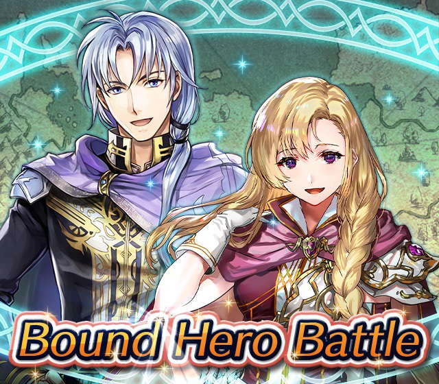 Map Rewards Description Availability Summoning event 2 (Hard) 3 (Lunatic) 4 (Infernal)Fire Emblem Echoes: Shadows of Valentia is the newest Fire Emblem title in the series. Now Heroes from that game are appearing in battle in Special Maps for a Bound Hero Battle with Alm & Celica !First availability: 2017-07-06T07:00:00Z – 2017-07-13T06:59:59Z Last availability: 2020-02-02T07:00:00Z – 2020-02-03T06:59:59Z 1 intermediary appearance Focus: Alm and Celica's Battle 2 (Hard) 3 (Lunatic) 4 (Infernal)The teacher-student pair from Fire Emblem: The Binding Blade is ready for battle! You can find these two powerful mages in Special Maps. It's time for a Bound Hero Battle with Cecilia & Lilina ! First availability: 2017-08-07T07:00:00Z – 2017-08-14T06:59:59Z Last availability: 2020-02-03T07:00:00Z – 2020-02-04T06:59:59Z 2 intermediary appearance Focus: Cecilia and Lilina's Battle 2 (Hard) 3 (Lunatic) 4 (Infernal)The two main characters from The Fire Emblem: The Sacred Stones game are ready for battle! You can find them in Special Maps. It's time for a Bound Hero Battle with Ephraim and Eirika ! First availability: 2017-09-07T07:00:00Z – 2017-09-13T06:59:59Z Last availability: 2020-02-04T07:00:00Z – 2020-02-05T06:59:59Z 1 intermediary appearance Focus: Ephraim and Eirika's Battle 2 (Hard) 3 (Lunatic) 4 (Infernal)Heroes from the Fire Emblem: The Blazing Blade game are coming to Special Maps for a Bound Hero Battle with Ninian and Hawkeye ! First availability: 2017-09-20T07:00:00Z – 2017-09-27T06:59:59Z Last availability: 2020-02-05T07:00:00Z – 2020-02-07T06:59:59Z 1 intermediary appearance Focus: Ninian & Hawkeye's Battle 2 (Hard) 3 (Lunatic) 4 (Infernal)Sister princesses of Macedon from the Fire Emblem: Mystery of the Emblem game appear in battle in Special Maps—it's Bound Hero Battle: Minerva & Maria ! First availability: 2017-10-11T07:00:00Z – 2017-10-18T06:59:59Z Last availability: 2020-02-05T07:00:00Z – 2020-02-07T06:59:59Z 1 intermediary appearance Focus: Minerva & Maria's Battle 2 (Hard) 3 (Lunatic) 4 (Infernal)These siblings from the Fire Emblem Fates : Birthright game are now in Special Maps—it's Bound Hero Battle: Takumi & Hinoka ! First availability: 2017-11-16T07:00:00Z – 2017-11-24T06:59:59Z Last availability: 2020-02-07T07:00:00Z – 2020-02-08T06:59:59Z 1 intermediary appearance Focus: Takumi & Hinoka's Battle 2 (Hard) 3 (Lunatic) 4 (Infernal)Tana: Winged Princess and Amelia: Rose of the War from Fire Emblem: The Sacred Stones are appearing in battle in Special Maps for a Bound Hero Battle with Amelia & Tana!First availability: 2017-12-14T07:00:00Z – 2017-12-23T06:59:59Z Last availability: 2020-02-08T07:00:00Z – 2020-02-09T06:59:59Z 1 intermediary appearance Focus: Tana & Amelia's Battle 2 (Hard) 3 (Lunatic) 4 (Infernal)Liege and retainer from Fire Emblem: The Blazing Blade , Raven: Peerless Fighter and Lucius: The Light are waiting in Special Maps for Bound Hero Battle: Raven & Lucius ! First availability: 2017-12-30T07:00:00Z – 2018-01-06T06:59:59Z Last availability: 2020-02-09T07:00:00Z – 2020-02-10T06:59:59Z 1 intermediary appearance Focus: Raven & Lucius's Battle 2 (Hard) 3 (Lunatic) 4 (Infernal)Corrin: Fateful Prince and Azura: Lady of the Lake from the Fire Emblem Fates game are here for Bound Hero Battle: Corrin & Azura !First availability: 2018-02-16T07:00:00Z – 2018-02-24T06:59:59Z Last availability: 2020-02-10T07:00:00Z – 2020-02-11T06:59:59Z 1 intermediary appearance Focus: Corrin & Azura's Battle 2 (Hard) 3 (Lunatic) 4 (Infernal)The prince and princess of Ylisse Chrom: Exalted Prince and Lissa: Sprightly Cleric are waiting in Special Maps for Bound Hero Battle: Chrom and Lissa First availability: 2018-03-18T07:00:00Z – 2018-03-25T06:59:59Z Last availability: 2020-02-11T07:00:00Z – 2020-02-12T06:59:59Z 1 intermediary appearance Focus: Chrom & Lissa's Battle 2 (Hard) 3 (Lunatic) 4 (Infernal)Here come two Manaketes from the Fire Emblem Awakening game, Tiki: Naga's Voice and Nowi: Eternal Youth . They're in Special Maps for Bound Hero Battle: Tiki & Nowi . First availability: 2018-04-10T07:00:00Z – 2018-04-17T06:59:59Z Last availability: 2020-02-12T07:00:00Z – 2020-02-13T06:59:59Z 1 intermediary appearance Focus: Tiki & Nowi's Battle 2 (Hard) 3 (Lunatic) 4 (Infernal)Siblings from different fathers, Seliph: Heir of Light and Julia: Naga's Blood , are in Special Maps for Bound Hero Battle: Seliph & Julia ! First availability: 2018-06-05T07:00:00Z – 2018-06-12T06:59:59Z Last availability: 2020-02-13T07:00:00Z – 2020-02-14T06:59:59Z 1 intermediary appearance Focus: Seliph and Julia's Battle 2 (Hard) 3 (Lunatic) 4 (Infernal)From the Fire Emblem: The Blazing Blade game, Hector: General of Ostia and Matthew: Faithful Spy are in Special Maps for Bound Hero Battle: Hector & Matthew ! First availability: 2018-07-05T07:00:00Z – 2018-07-12T06:59:59Z Last availability: 2020-02-14T07:00:00Z – 2020-02-15T06:59:59Z 2 intermediary appearance Focus: Hector & Matthew's Battle 2 (Hard) 3 (Lunatic) 4 (Infernal)From the Fire Emblem Fates game, Leo: Sorcerous Prince and Elise: Budding Flower are in Special Maps for Bound Hero Battle: Leo & Elise ! First availability: 2018-07-22T07:00:00Z – 2018-07-29T06:59:59Z Last availability: 2020-02-15T07:00:00Z – 2020-02-16T06:59:59Z 1 intermediary appearance Focus: Leo & Elise's Battle 2 (Hard) 3 (Lunatic) 4 (Infernal)From the Fire Emblem: Radiant Dawn game, Micaiah: Priestess of Dawn and her protector, Sothe: Zephyr , are in Special Maps for Bound Hero Battle: Micaiah & Sothe ! First availability: 2018-08-20T07:00:00Z – 2018-08-28T06:59:59Z Last availability: 2020-02-16T07:00:00Z – 2020-02-17T06:59:59Z 1 intermediary appearance Focus: Micaiah & Sothe's Battle 2 (Hard) 3 (Lunatic) 4 (Infernal)From the Fire Emblem: Thracia 776 game, Ishtar: Thunder Goddess and Reinhardt: Thunder's Sword are waiting in Special Maps for Bound Hero Battle: Ishtar & Reinhardt ! First availability: 2018-10-04T07:00:00Z 